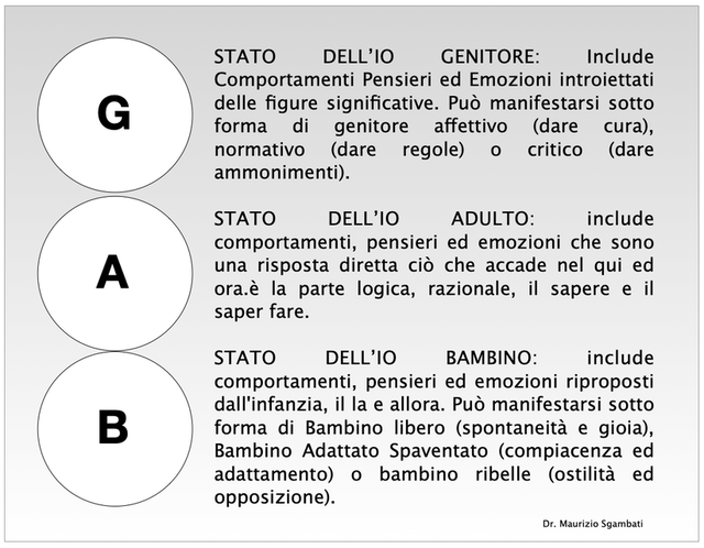 Dal punto vista teorico la personalità è suddivisa in 3 Stati dell'Io: Genitore, Adulto e Bambino. All'interno del Bambino e del Genitore sono interiorizzati sia valori e messaggi utili che convinzioni limitanti; nel primo i divieti (ingiunzioni) e nel secondo i doveri/spinte (contro-ingiunzioni). Il disagio viene percepito quanto la persona anziché rispondere alle situazioni con modalità dell'Adulto ripropone inconsciamente atteggiamenti infantili che rispecchiano il bambino che è stato ed atteggiamenti genitoriali (protettivi o normativi) appresi dalla figure significative. Ogni persona tende a riproporre nel "qui e ora" modi di pensare, agire e sentire dell' "allora" come sotto affetto di un elastico temporale, ovvero modalità stereotipate.